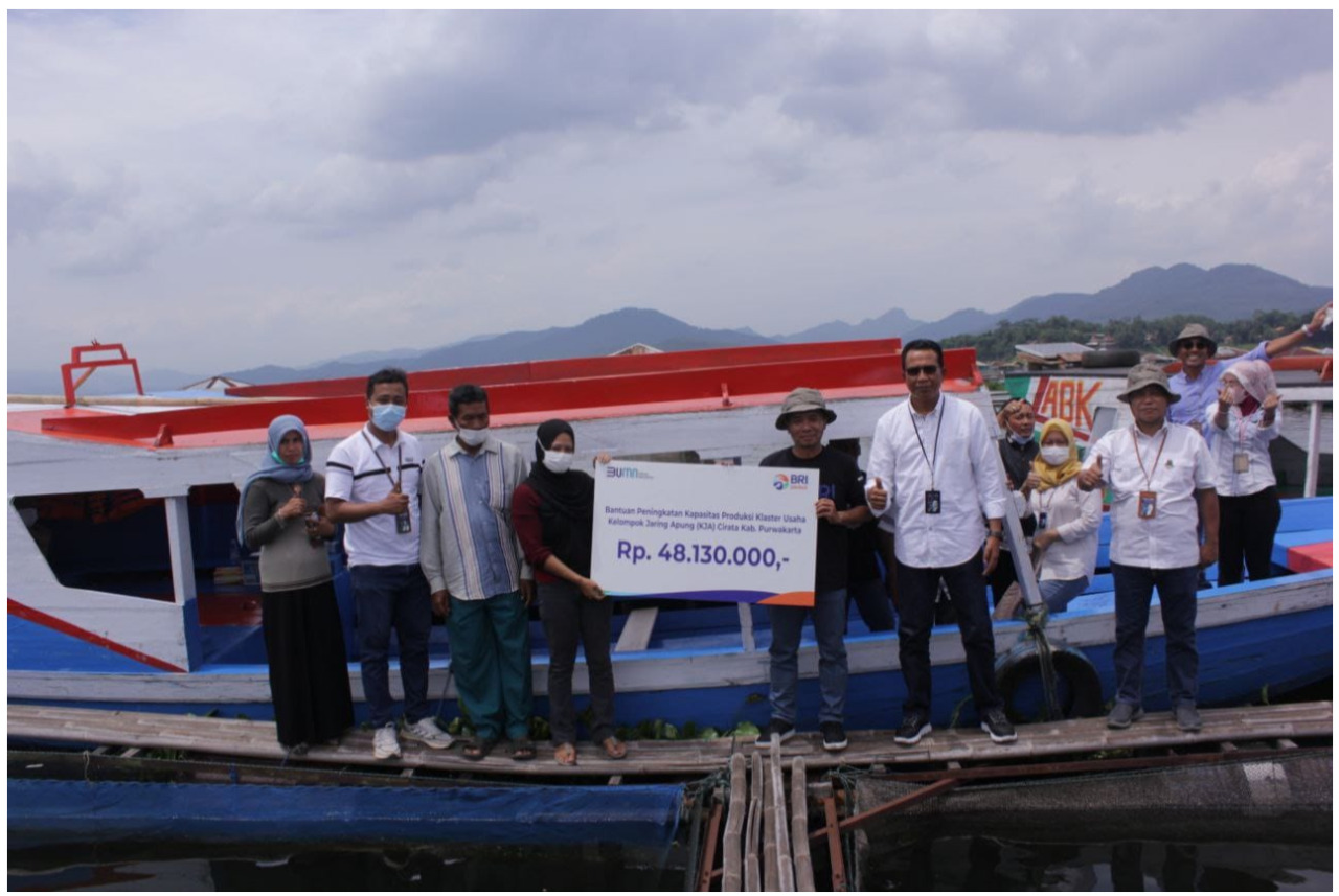 Dalam rangka mendukung dan mengembangkan UMKM, BRI melalui Program BRI Peduli memberikan bantuan berupa satu unit perahu kepada Klaster Usaha Kelompok Jaring Apung di wilayah Benduangan Cirata Kabupaten Purwakarta. Bantuan tersebut diberikan untuk mempermudah kegiatan budidaya ikan di lokasi tersebut. Kegiatan budidaya ikan dilakukan menggunakan sarana keramba yang ditempatkan di Bendungan Cirata. Selain bantuan berupa perahu, BRI juga memberikan bantuan berupa pelatihan budidaya ikan bioflok. Bantuan pelatihan tersebut bertujuan untuk memberikan solusi bagi petani yang tidak memiliki lahan di bendungan tetapi memiliki lahan di darat dapat melakukan budidaya ikan kolam bioflok. Semua bantuan tersebut diharapkan dapat membantu kelompok usaha dalam meningkatkan produktivitas usahanya.