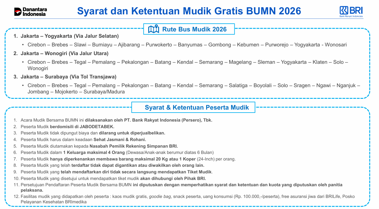 BRI bekerja sama dengan operator transportasi yang memenuhi standar keselamatan, kelayakan armada, serta ketentuan regulasi Angkutan Lebaran yang berlaku.