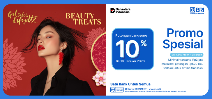 - Customer yang berbelanja menggunakan BRI Debit, BRI Kartu Kredit dengan minimal pembelanjaan Rp3.000.000,- untuk produk Kosmetik & Parfum akan mendapatkan potongan langsung 10% dengan maksimal potongan Rp500.000,-